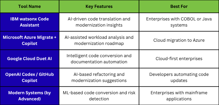 AI tools for legacy code modernization offer enterprises a faster, safer, and more cost-effective path to modernization by automating complex tasks and mitigating migration risks.